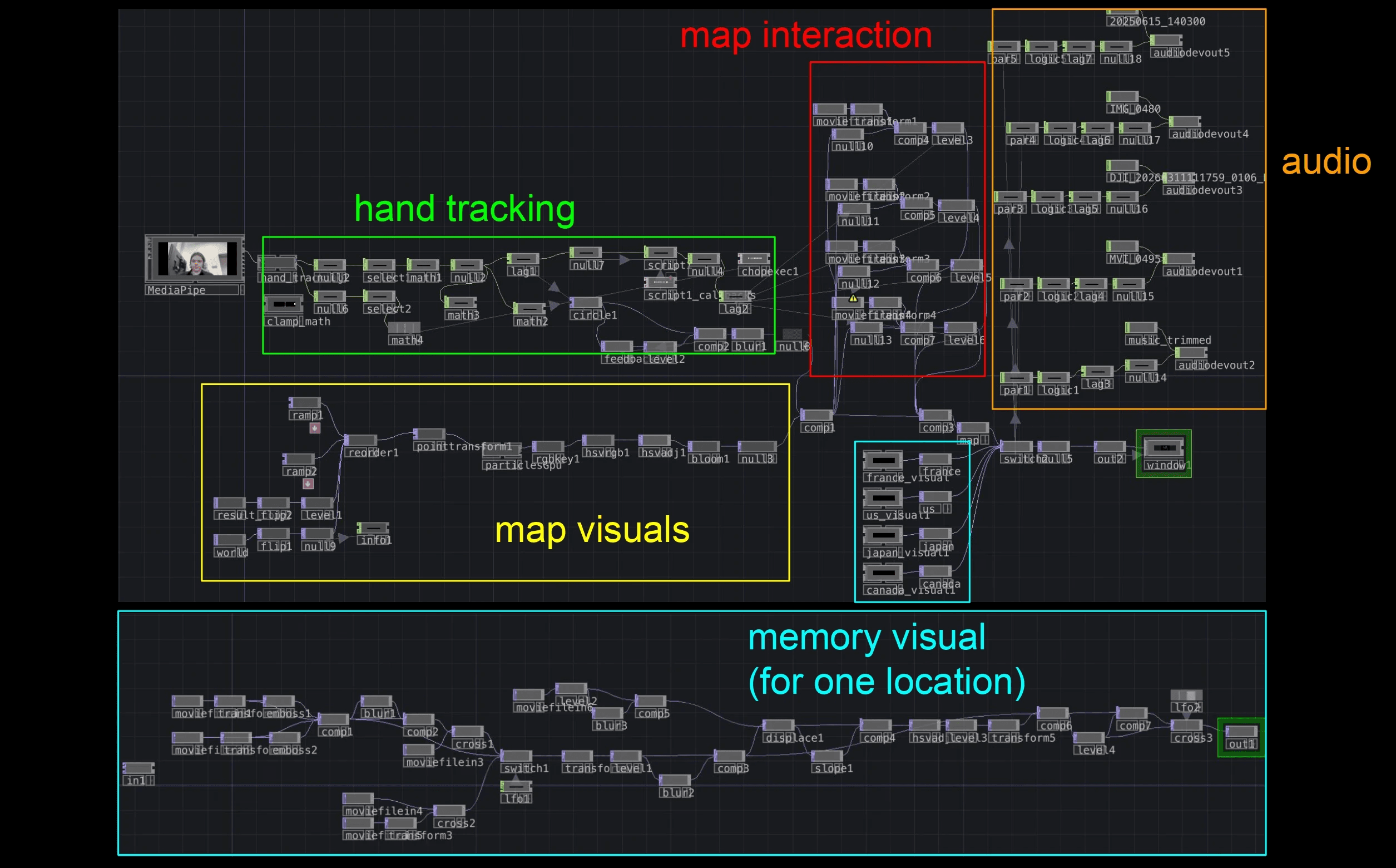 Voyager is an interactive experience built with TouchDesigner and Python that acts as a personal exploration of memory and culture. It began as an interest in the capabilities of TouchDesigner and expanded into a kind of self-portrait, or diary of my own memories.